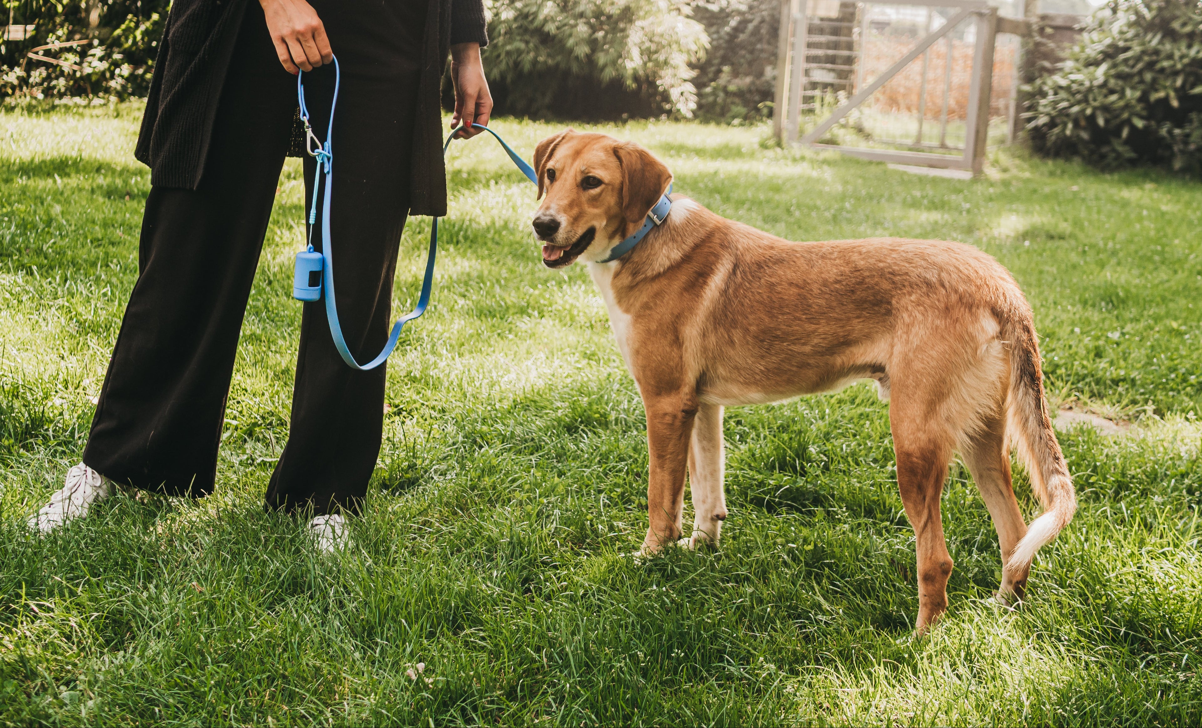 Halsband, Leine & Kotbeutelhalter aus langlebigem, wasserabweisendem PVC – stylisch, pflegeleicht und perfekt für jedes Abenteuer. Und das Beste: Mit jedem Kauf hilfst du Hunden in Not.