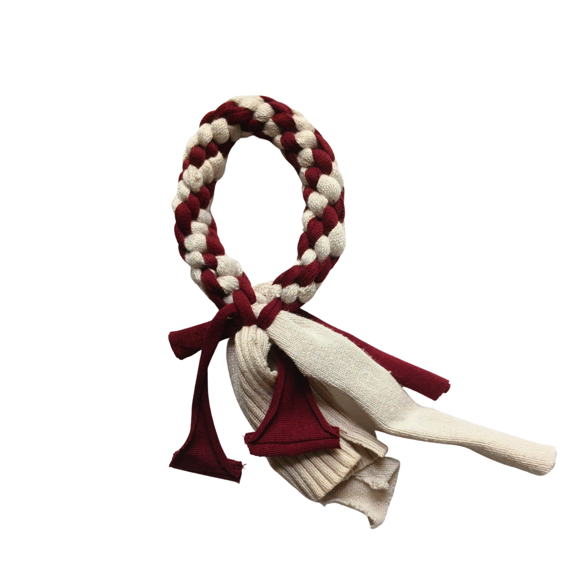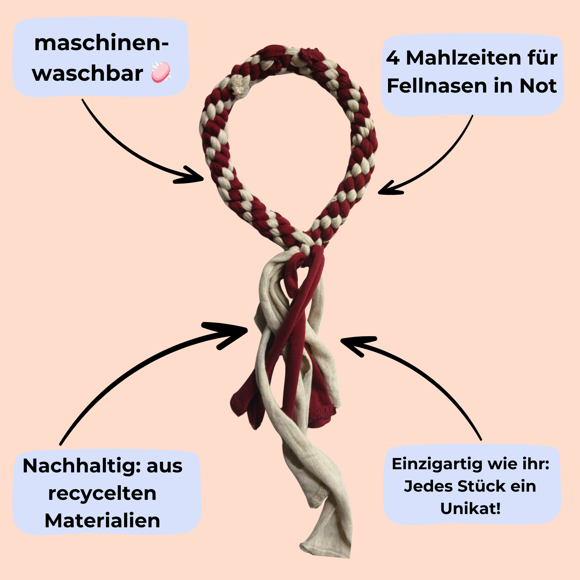 Unser runder Zergel ist nicht nur das perfekte Spielzeug für wilde Zerrspiele, gemeinsamen Spaß und ausgelassenes Apportieren. Er ist auch ein echtes Statement-Piece: Nachhaltig gefertigt aus recycelten Materialien ist jedes Stück ein echtes Unikat. Mit dem Spielzeug haucht dein Hund im Spiel den Stoffen neues Leben ein.